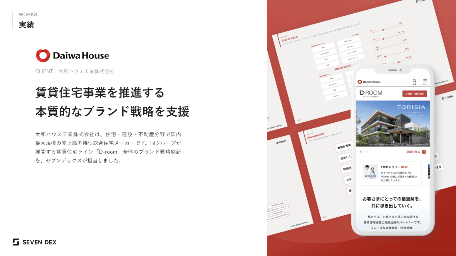 大和ハウスグループの賃貸住宅ブランド「D-room」は成長していた一方で、時代の変化に合わせてブランドコミュニケーションを見直し、事業の推進力になるブランドへ再定義する必要がありました。また、事業展開が広がる中で、ブランドの一貫性が弱まりつつあったことも課題でした。