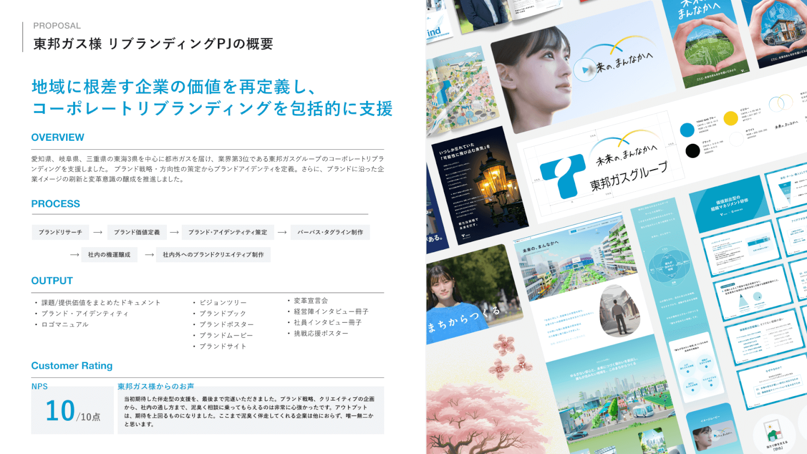 カーボンニュートラル推進で市場環境が変化する中、東邦ガスグループさまでは目指す方向性の明確化と社内外の企業イメージ刷新が求められていました。セブンデックスは約1年半、コーポレートリブランディングを包括支援しました。