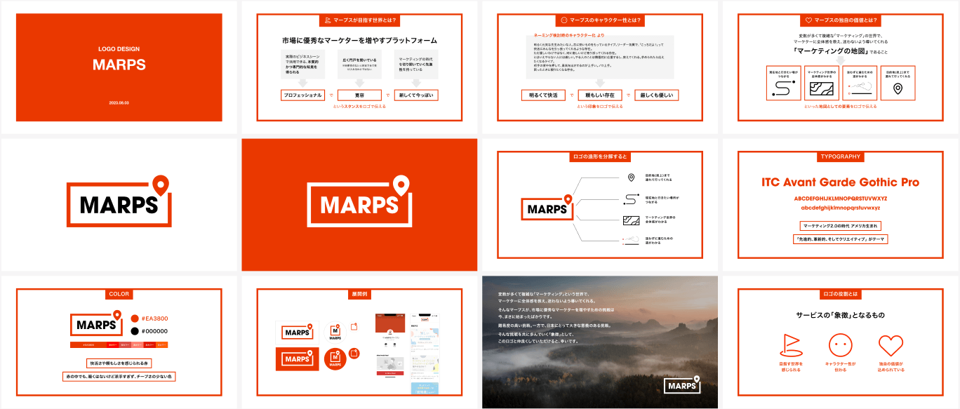 ロゴ案の確定後、ガイドラインを作成。最後に、クライアントのプロダクトチームの皆様に、「表現の意図やコンセプト、ルールなどを共有する場」を設けて頂き、今後もサービスとしての表現が一貫して崩れないための説明会を実施しました。