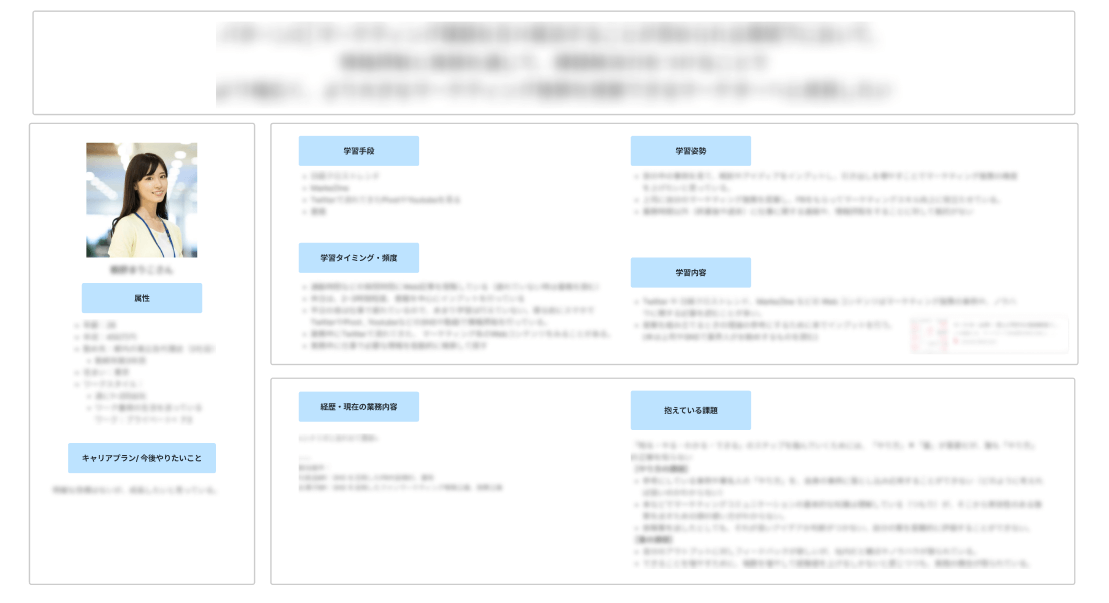 次に、ターゲット理解を深めるためUXリサーチを実施。 10名ほどにデプスインタビューを行い、発話をKA法で分析して「価値マップ」を作成しました。 リサーチ結果をもとに、競合が満たせていないニーズや潜在インサイトを特定し、サービスが狙うべきペルソナ像を再定義。