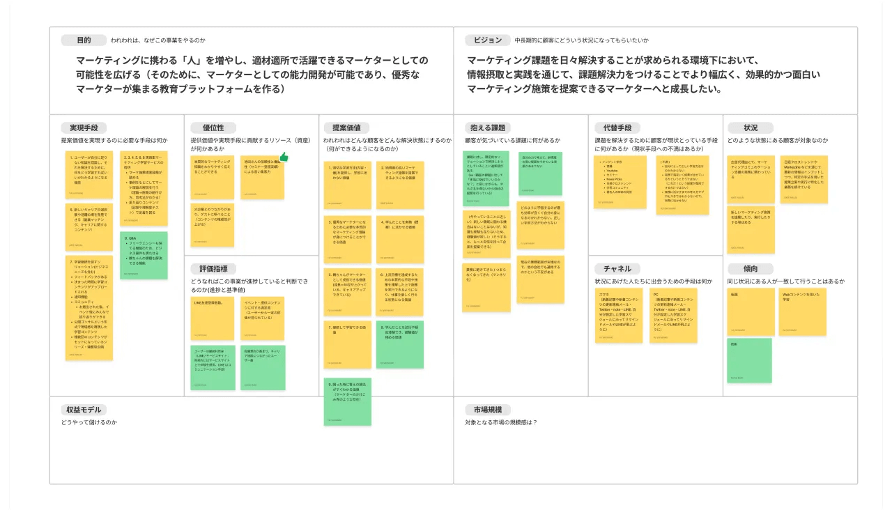まずは事業の背景と目指すビジョンを明確にするため、経営層へのインタビューと構想整理を実施。 同時に市場や競合を分析し、「既存サービスが提供している価値・できていない価値」を整理していきました。