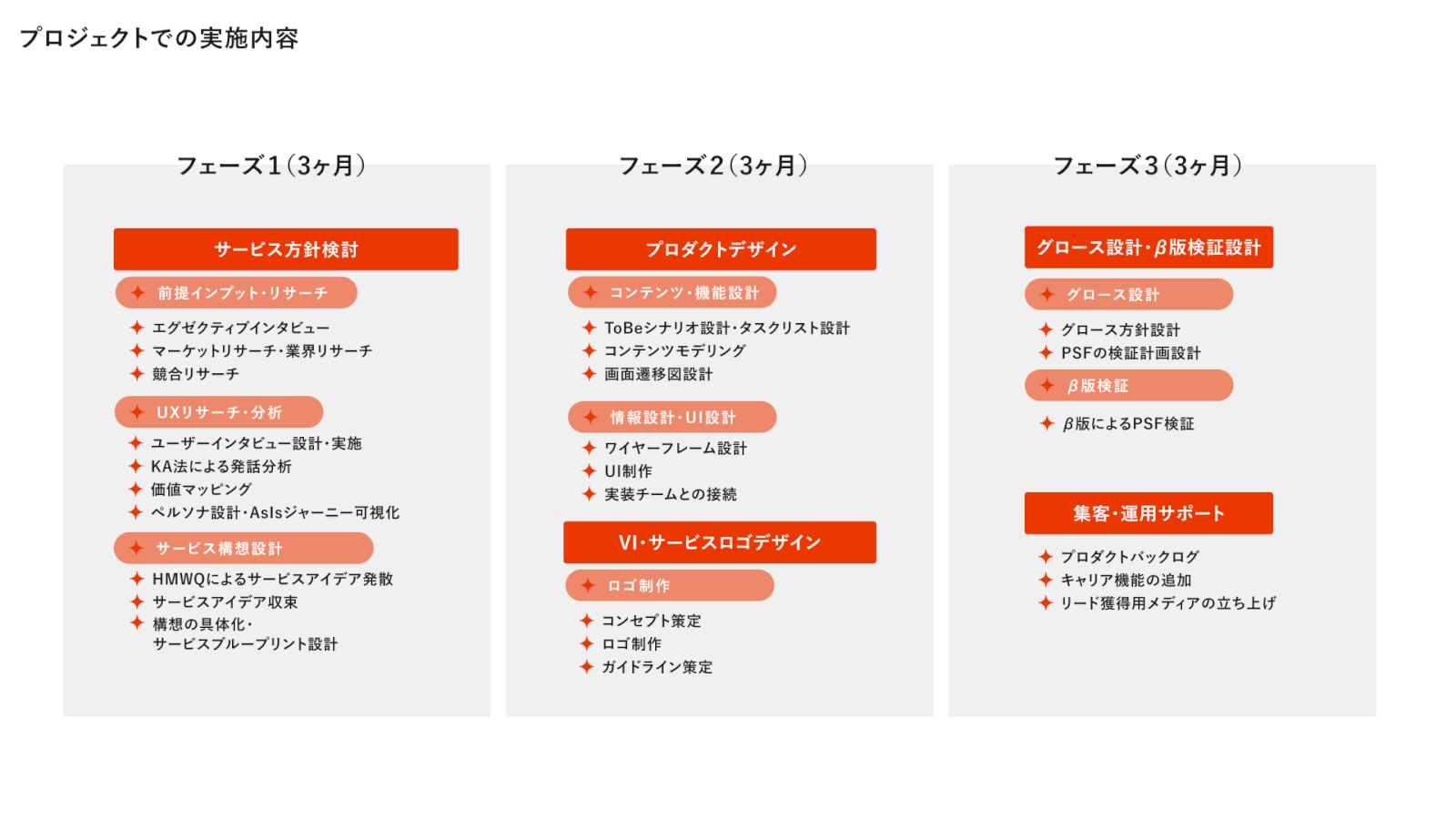 エグゼクティブインタビュー/マーケットリサーチ/UXリサーチ・分析/サービス構想検討/プロダクトデザイン/ロゴ・VI策定/β版検証/グロース設計 ..etc