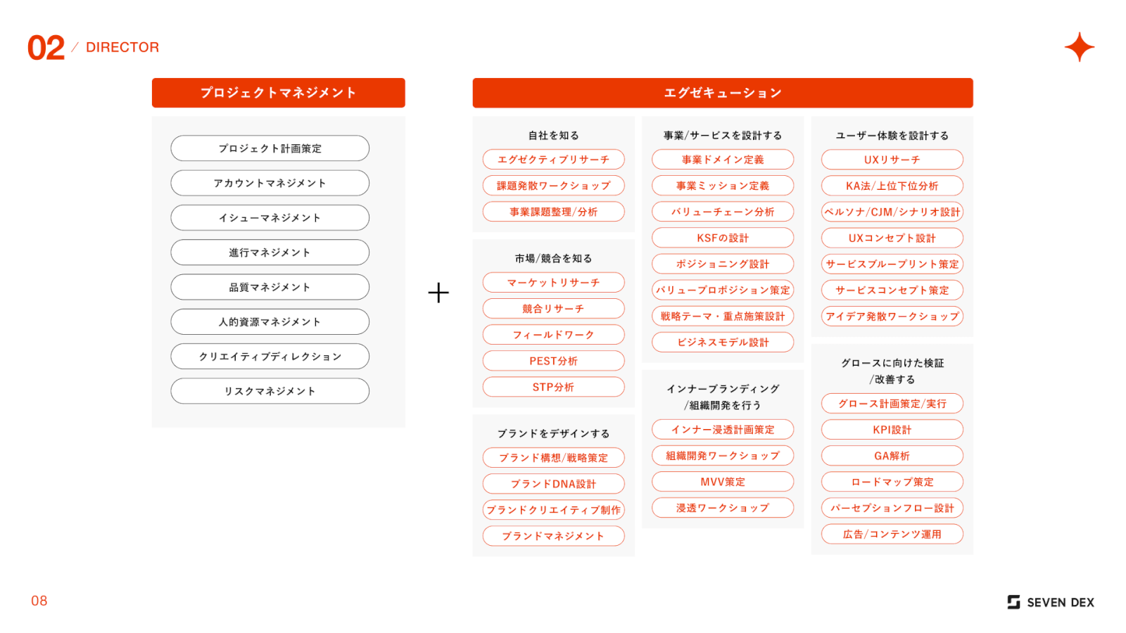 また「実務の執行(エグゼキューション)」の範囲は広く、クライアント企業や事業の戦略策定からブランドの設計、体験設計、グロースに向けた分析から改善まで、あらゆる領域に対応します。
