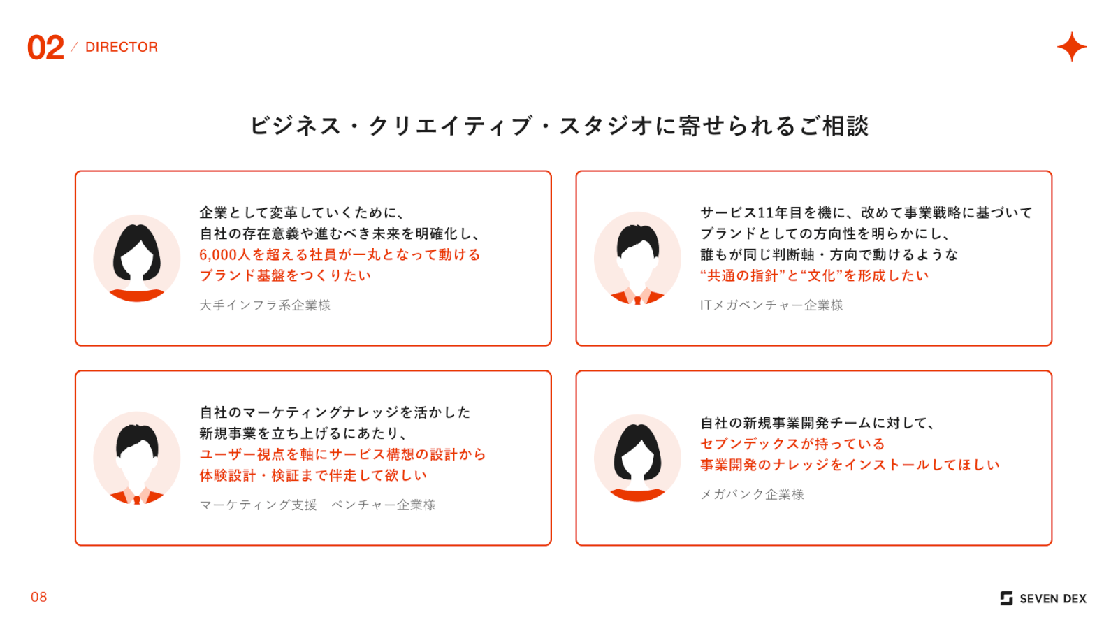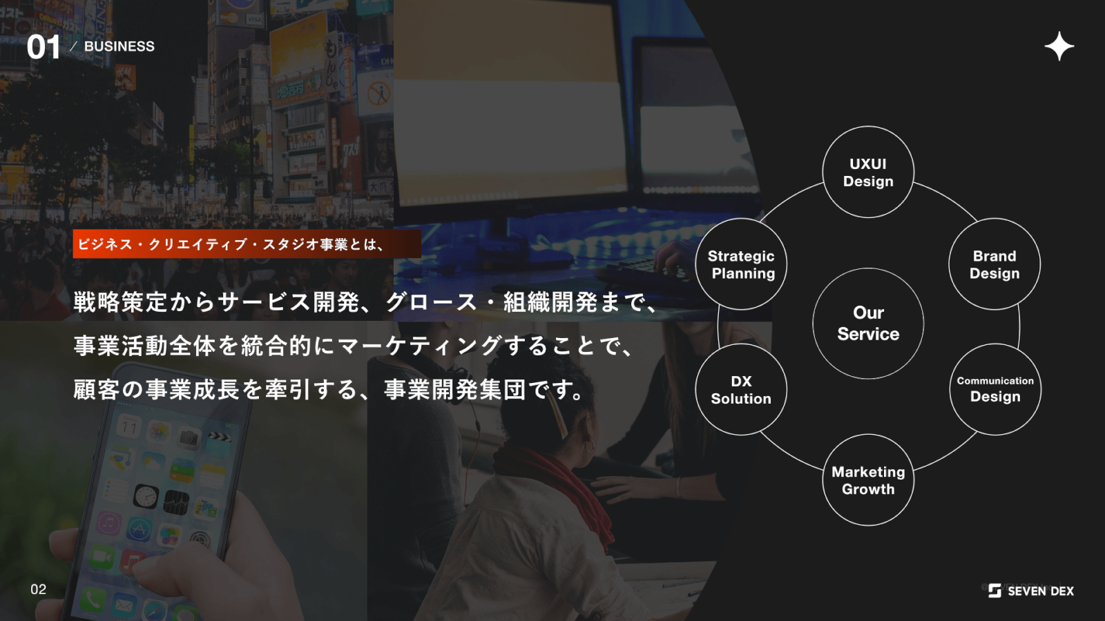 セブンデックスが運営する事業「ビジネス・クリエイティブ・スタジオ」では、戦略策定からサービス開発、グロース・組織開発まで事業活動全体を統合的にマーケティングし、顧客の事業課題解決と事業利益の最大化にコミットする支援を行っています。