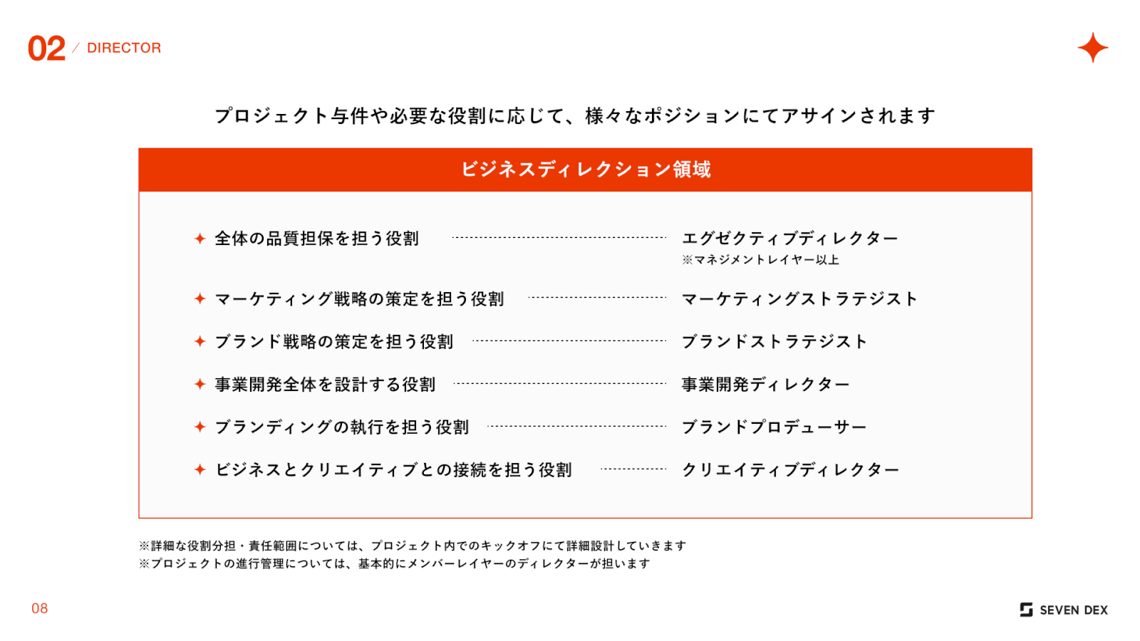 ビジネス・ディレクション領域の中でも、マーケティングストラテジスト・事業開発ディレクターなどいくつかのポジションがあります。1人1ポジションではなく、「この案件ではマーケティングストラテジスト」、「別の案件では事業開発ディレクター」といった形で、プロジェクトごとに最適な役割にてアサインされます。