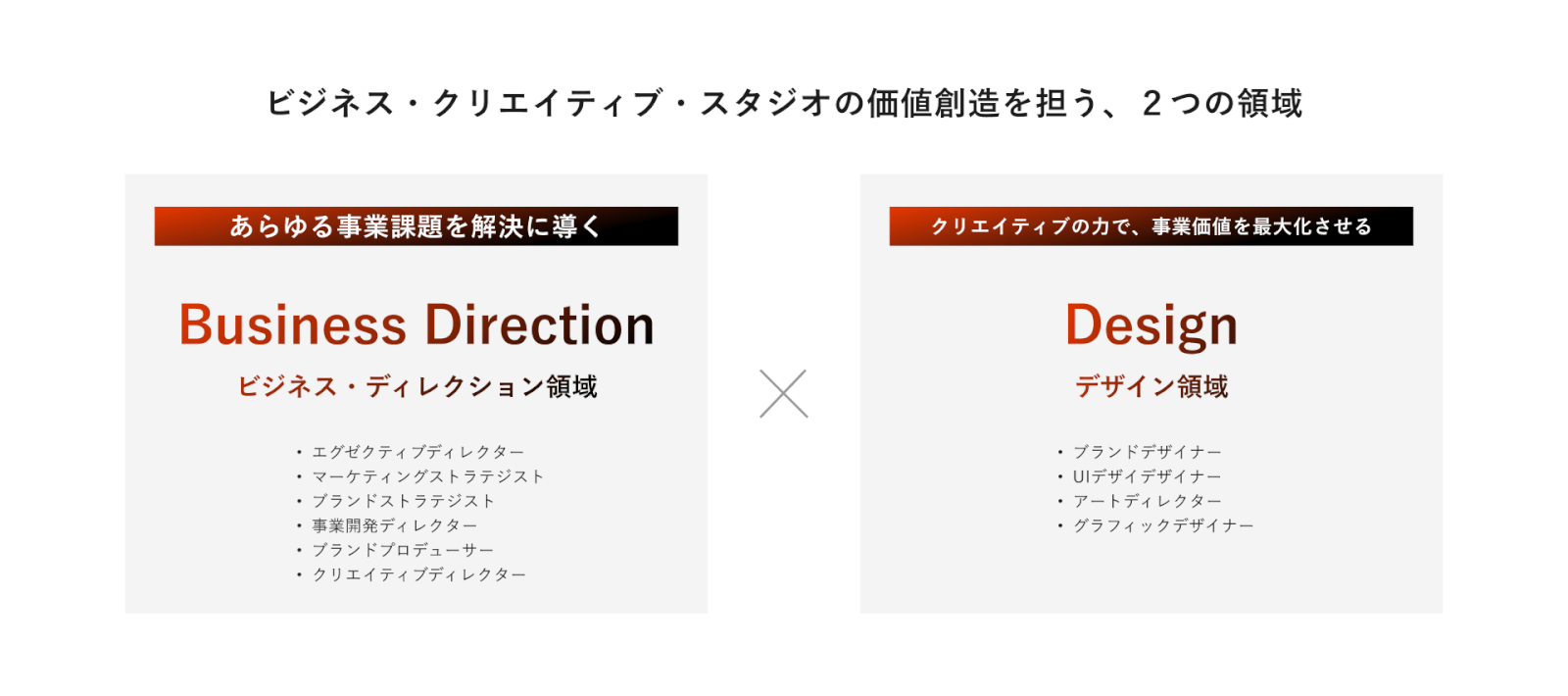 ビジネス・クリエイティブ・スタジオでは、顧客に対する提供価値を担保する役割として「ビジネス・ディレクション領域」と「デザイン領域」の2つの役割を設定しています。そして、各領域の中でさらに職種が細分化されるという仕組みになっています。