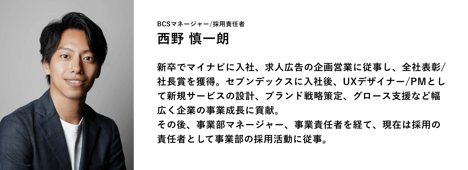 本記事では、ディレクターとしてあらゆる顧客の事業課題解決を経験し、ビジネス・クリエイティブ・スタジオ事業の責任者まで経験した西野に、ビジネスディレクション領域の仕事の魅力について語ってもらいました。