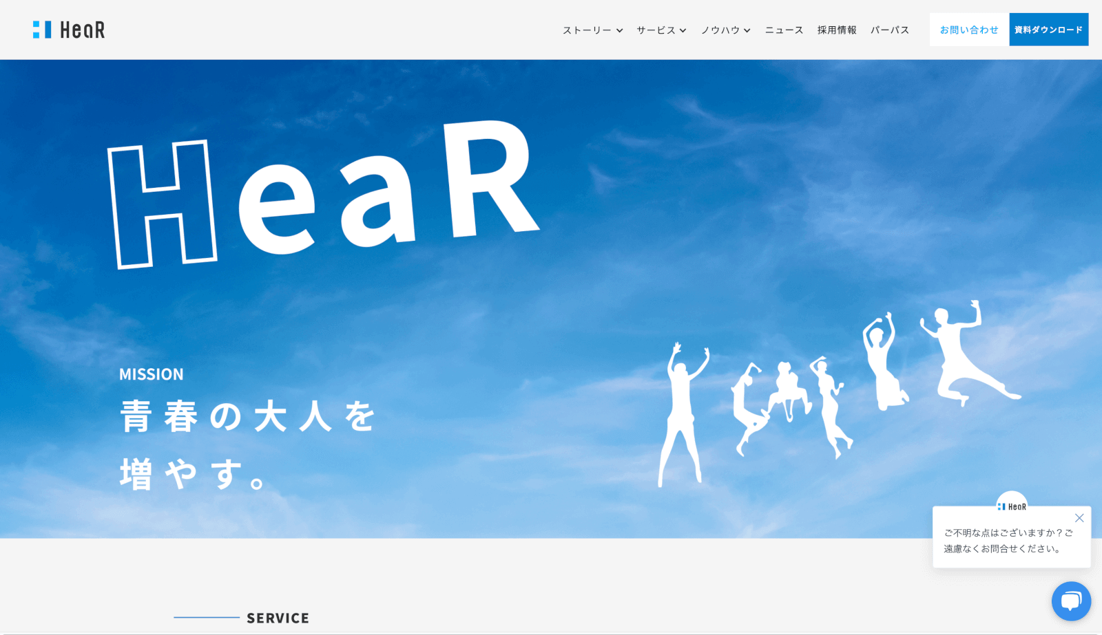 株式会社HeaRは、「青春の大人を増やす」というミッションを掲げ採用コンサルティングや採用代行を行う企業です。100社以上の採用支援を行う中で培われたノウハウを「HeaRメソッド」として体系化しており、特にPoD(求職者が求めていて競合が提供できない機能)を意識した採用ブランディングを提供します。