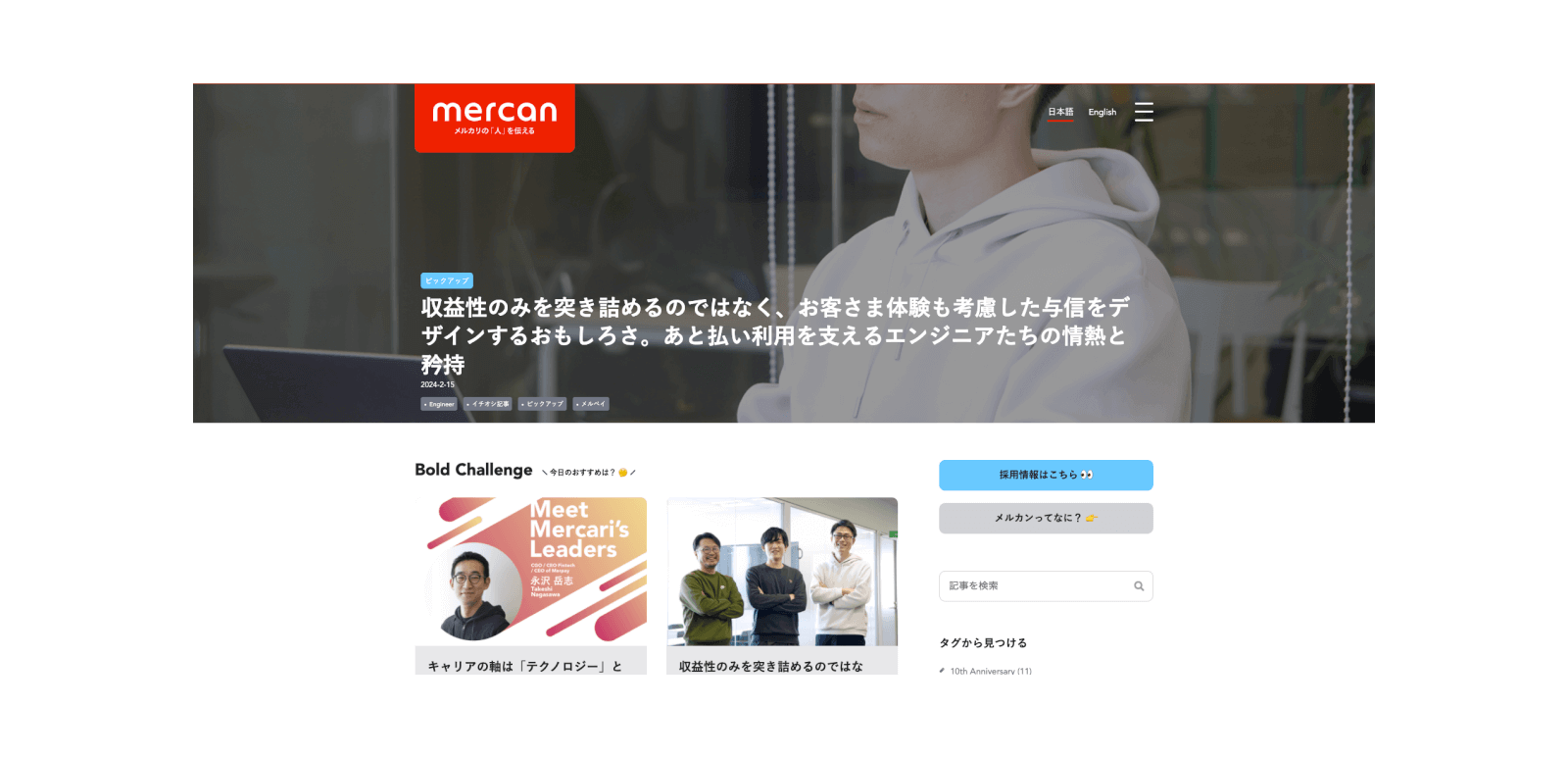 メリカリは、オウンドメディア”mercan(メルカン)”によって、採用ブランディングを成功させました。mercanは、「社外と社内の情報のイメージ格差をなくし、入社後のミスマッチをなくす」という目的で立ち上げられました。あくまでプロダクトではなく、”人”に起点を起きブランディングをすることで、イメージ格差がなくなるように設計されています。創刊からたったの2年半で1000本以上の記事を公開し、創業して5年で1000人規模の企業に成長しました。