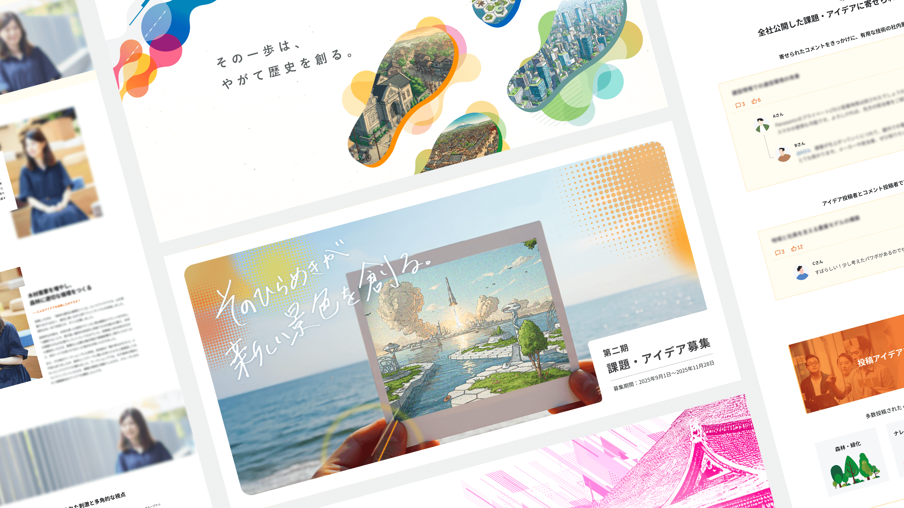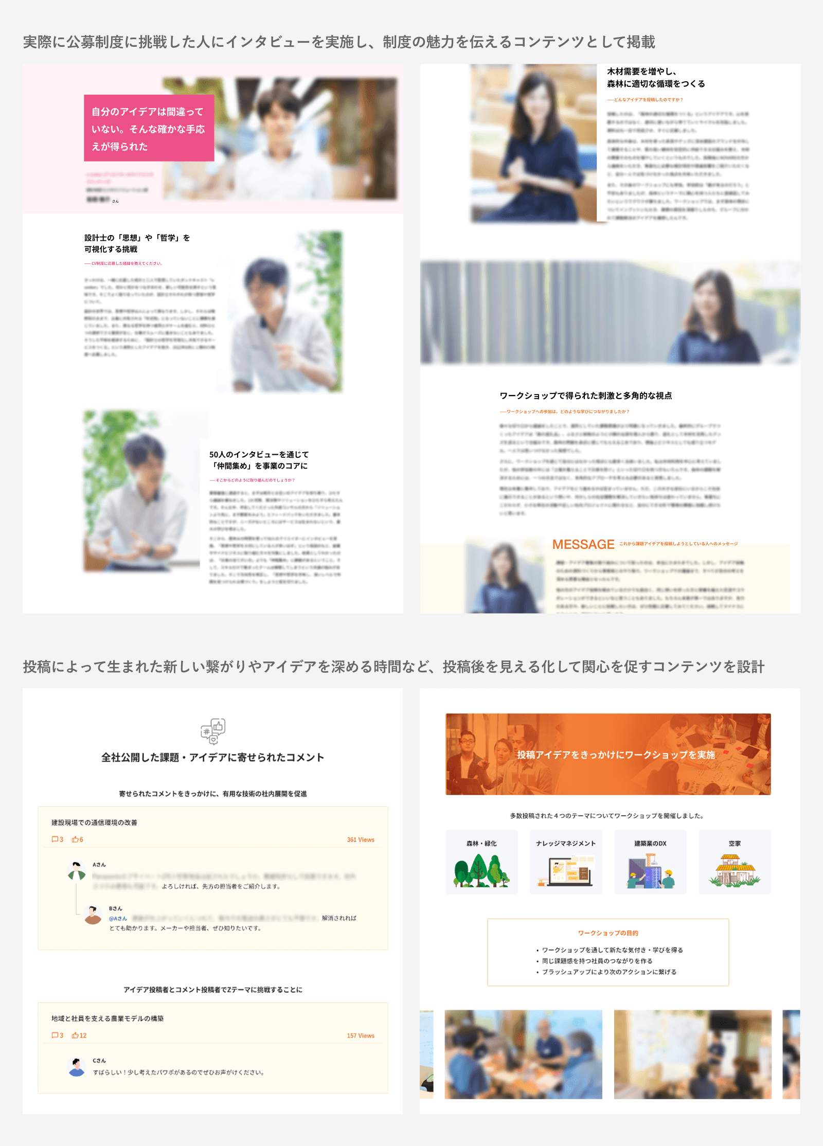 課題・アイデア募集制度では、投稿アイデアの成果や進捗を紹介するほか、過去の投稿を通じて生まれた交流や共創のエピソードを取り上げ、他の社員との交流を感じられる構成に。これにより、「ふとした気づき」や「こんなことができたら」という発想を共有することによって生まれる、新しい出会いや発見を知ってもらえるようにしました。
