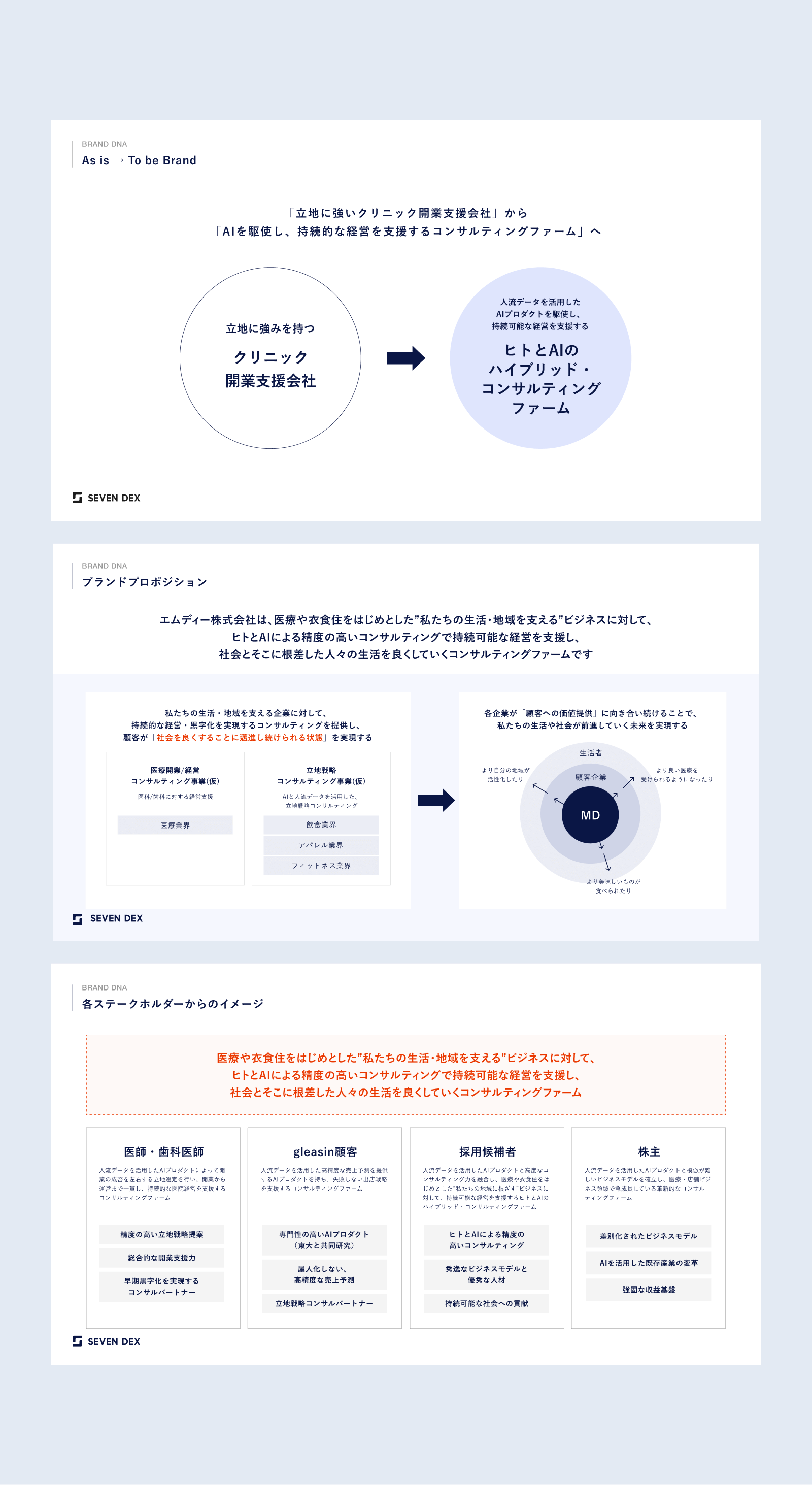 本プロジェクトは、そうした課題意識のもと、企業成長を支えるブランドの再構築を目的としてスタートしています。ステークホルダーから信頼され、共感され、選ばれ続けるブランド像を描くこと。それがエムディー株式会社の次のステージに向けた重要なテーマであり、セブンデックスが伴走する理由でもありました。