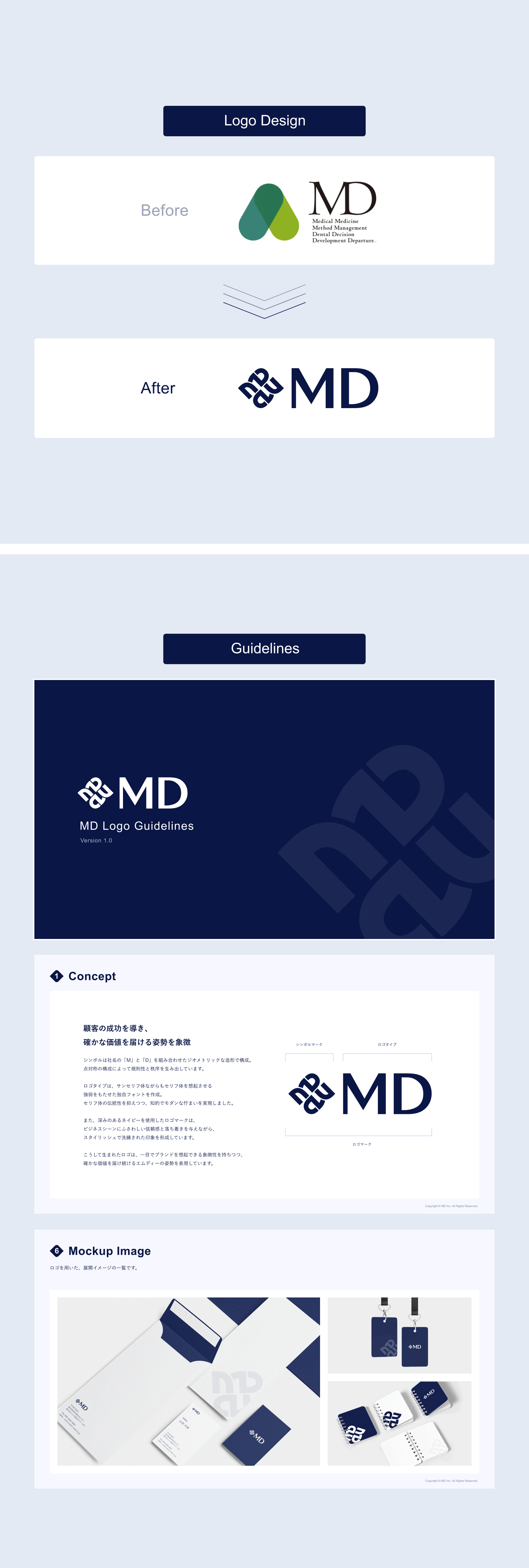エムディー株式会社のブランドDNAを視覚的に体現するため、ロゴ・カラー・タイポグラフィを含むビジュアルアイデンティティの再設計に取り組みました。ブランドDNAを起点に、視覚表現全体を一貫して構築しています。