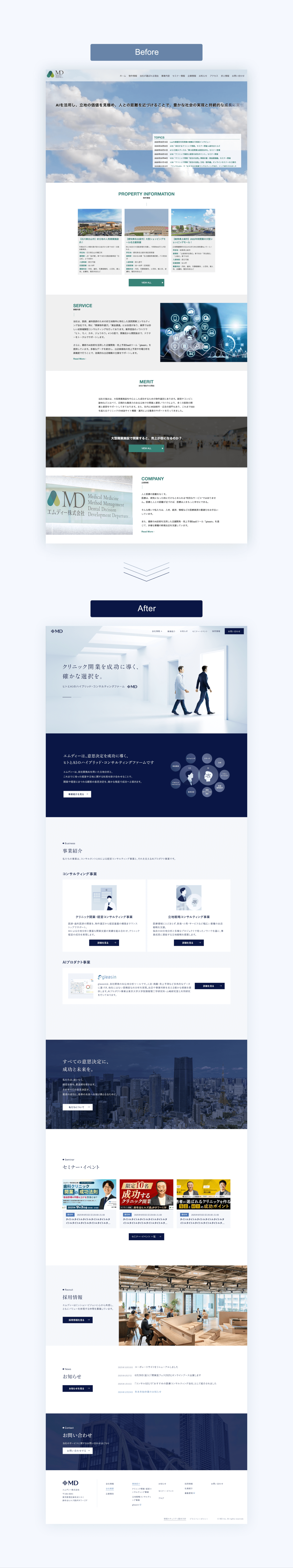 ステークホルダーごとの関心を整理した情報設計に加え、レイアウトや余白、動きに至るまで、エムディーらしい知性・信頼感・先進性を感じられる表現を設計。